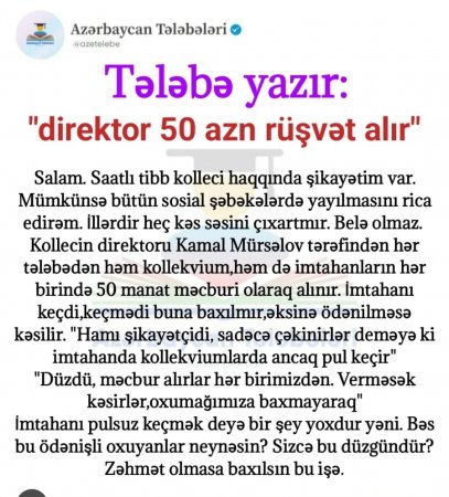 "Tələbə yazır: "Direktor 50 AZN rüşvət alır"