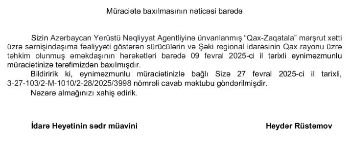 Vətəndaşın müraciətinə AYNA tərəfindən göndərilən cavab məktubu problemin həll olunmadığını və araşdırılmadığını göstərir. Agentliyin məktubunda bildirilir ki, vətəndaşın 09 fevral 2025-ci il tarixli müraciətinə baxılıb və 27 fevral 2025-ci il tarixində rəsmi cavab göndərilib. Lakin məktub ümumi ifadələrlə yazılıb və konkret tədbirlərin görülməsinə dair heç bir açıqlama verilməyib. Bu isə vətəndaşda AYNA-nın problemi ört-basdır etməyə çalışdığı təəssüratını yaradıb.