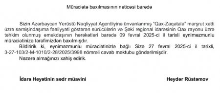 Azərbaycan Yerüstü Nəqliyyat Agentliyinin (AYNA) sərnişindaşıma sektorunda nəzarətsizlik və qanunsuz fəaliyyətlə bağlı narahatlıq doğuran iddialar səsləndirilib. Zaqatala rayonunda sərnişindaşıma fəaliyyəti göstərən bir sürücü AYNA-ya müraciət edərək, "Qax-Zaqatala" marşrutu üzrə bəzi sürücülərin avtovağzal ərazisindən kənarda, şəhərin intensiv nəqliyyat axını olan hissəsində qanunsuz fəaliyyət göstərdiyini bildirib və bu məsələyə nəzarət olunmasını xahiş edib. Lakin müraciətə verilən cavab vətəndaşın narazılığına səbəb olub.
