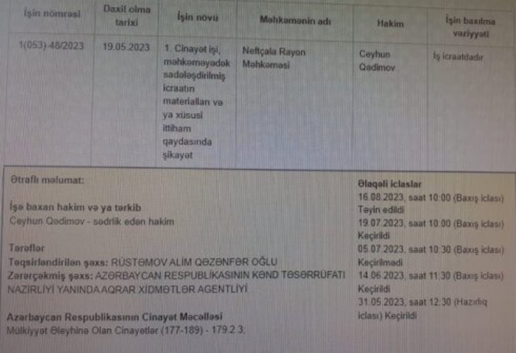 Bu günlərdə redaksiyamıza daxil olan məlumata görə, Neftçala DAİM -in direktoru Ramil Salmanovun havadarlıq etdiyi Azərbaycan Respublikasının Cinayət Məcəlləsinin 179.2.3, 179.2.4 və 313 — cü maddələri ilə ittiham olunan Neftçala HSBXİ — nin rəisi Alim Rüstəmovun 1(053)-48/2023 saylı cinayət işinə Neftçala rayon məhkəməsinin hakimi Ceyhun Qədimov tərəfindən 19.05.2023 –cü il tarixdən baxılır. Sonuncu məhkəmə prosesi 16.08.2023 –cü il tarixdə olacaq.