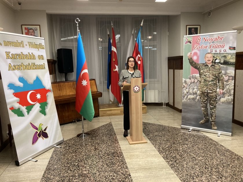 Tədbirdə çıxış edən Türkiyənin Estoniyadakı səfiri Başak Türkoğlu və Estoniya-Azərbaycan parlamentlərarası dostluq qrupunun sədri xanım Riina Solman mühüm tarixi hadisə ilə bağlı xalqımızı təbrik ediblər. Türkiyənin Azərbaycanla Qələbə sevincini bölüşdüyü, daim Azərbaycanın yanında olduğu bir daha nəzərə çatdırılıb. Estoniyanın hər zaman Azərbaycanın ərazi bütövlüyünü dəstəklədiyi vurğulanıb, Azərbaycan dövləti tərəfindən işğaldan azad olunmuş ərazilərdə aparılan bərpa-quruculuq işlərinin nəticəsində soydaşlarımızın öz torpaqlarına tezliklə qayıdacaqlarına əminlik ifadə edilib. Tədbir Zəfər Gününə həsr olunmuş videoçarxın nümayişi ilə davam edib.