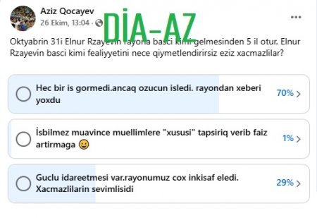 "DİA-AZ bildirir ki, bu ilin oktyabr ayının 31-i tarixində vəzifə başında 5-ci ildönümünü keçirən Elnur Rzayevin Xaçmaza necə rəhbər olmasını müəyyənləşdirmək üçün yerli sakinlər sosial şəbəkələrdə sorğu keçirmək istəsələr də... bu baş tutmayıb.