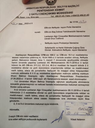 Həbsxanadan azad olunduğum zaman, Ədliyyə Nazirliyinin Pentensiar Xidmətinin 2 saylı cəzaçəkmə müəssisəsindən mənə verilən buraxılış vərəqəsində, mənim prezident İlham Əliyev tərəfindən əfv edildiyimi göstərən sənəddə mənim 311.3.2,311.3.4, və ən əsası 46.2 ci maddə,2 il müddətinə dövlət və yerli özünüidarə orqanlarında rəhbər və maddi -məsul vəzifə tutma,eləcədə jurnalistika fəaliyyəti ilə məşğul olma hüququndan məhrum edilmə əfv edildiyi göstərilir.