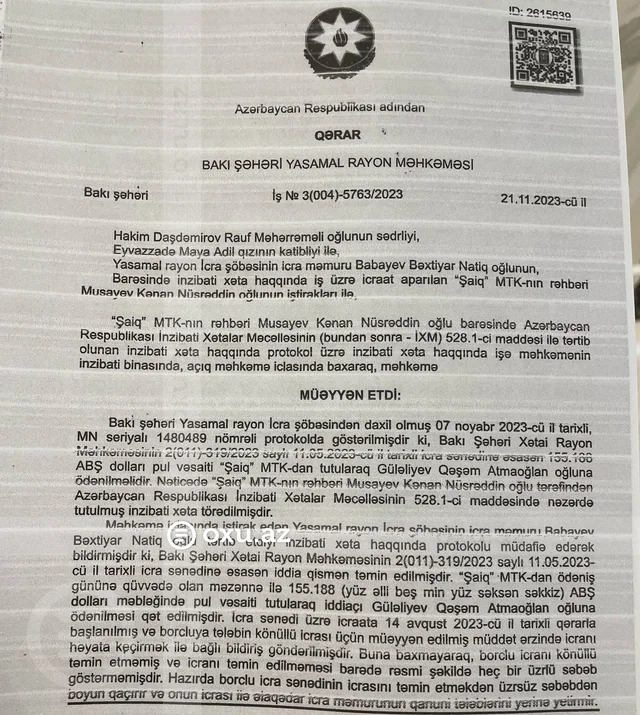 2023-cü il may ayının 19-da məhkəmə qərar çıxardı ki, 155 188 dollar dəymiş ziyan ödənilsin. Pulu ödəmədilər, prosesi icra etmədikləri üçün sonuncu dəfə 1200 manat cərimə olunublar. Deyirlər, pulumuz yoxdur. Onun adına ölkədə heç bir əmlak yoxdur. MTK-larını direktorlara verib. İcraçı direktorları da tez-tez dəyişir. 19 il keçib, hələ də ödəmir".