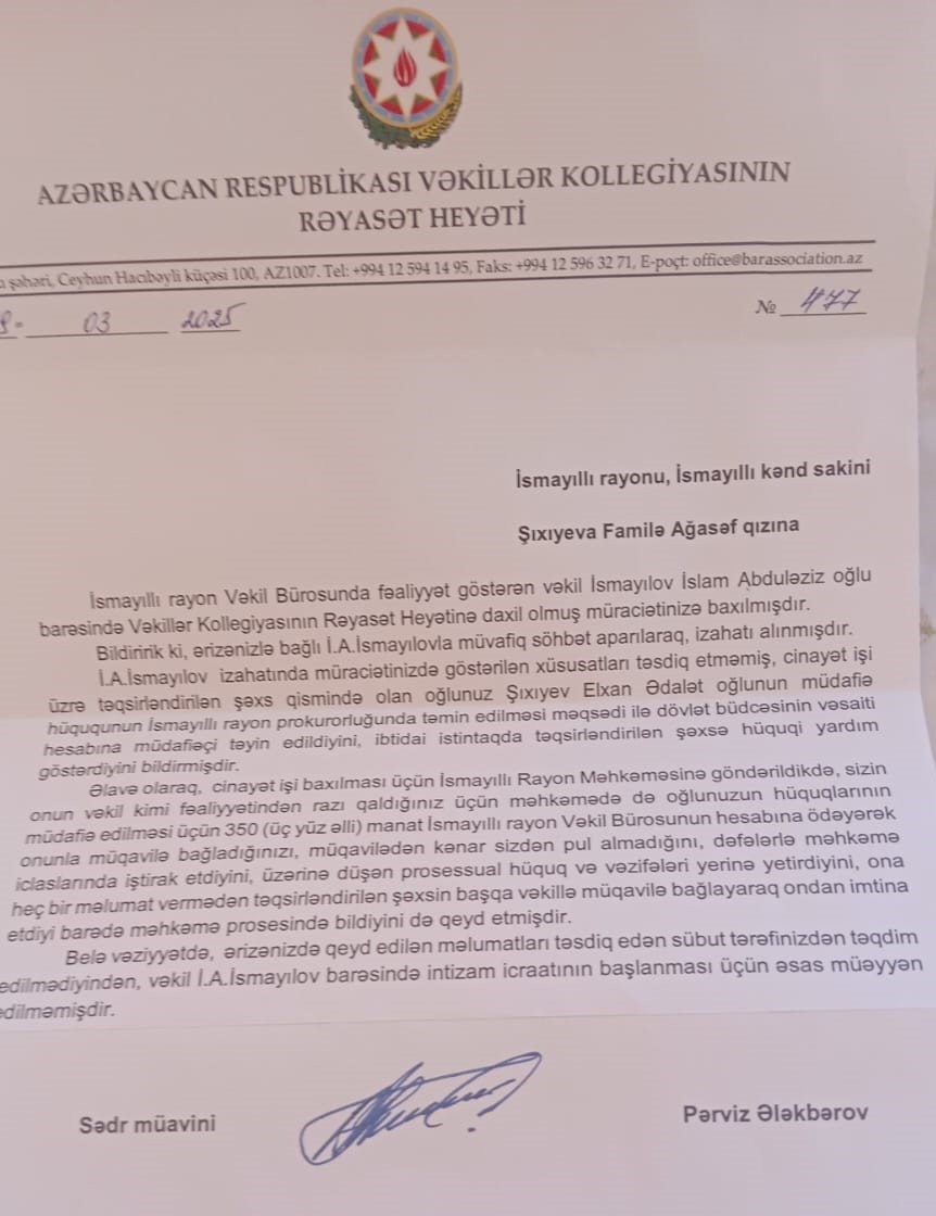 Redaksiyamıza daxil olan məlumata görə, Vəkillər Kollegiyasının üzvü olan vəkil İsmayılov İslam Abduləziz oğlunun davranışı ilə bağlı şikayət daxil olub. Şikayətçi tərəf hazırda təqsirləndirilən şəxs statusunda olan E.Şıxıyevin anası Familə Şıxıyevandır.