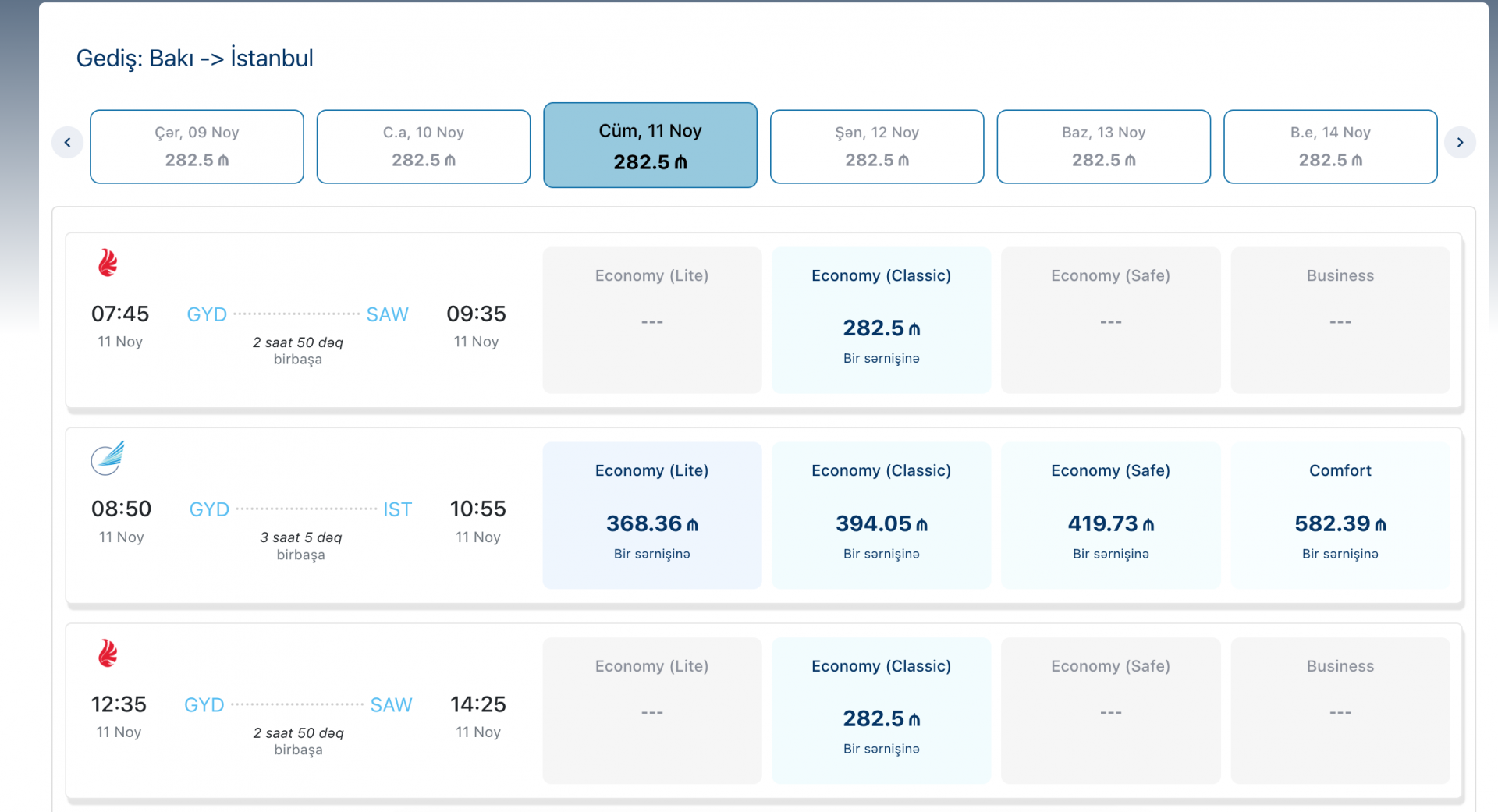 Cavab üçün gəlin azal.az rəsmi saytına keçək, burada bizə ən yaxın tarixlər (noyabr) üçün belə qiymət bölgüsü təklif olunur.