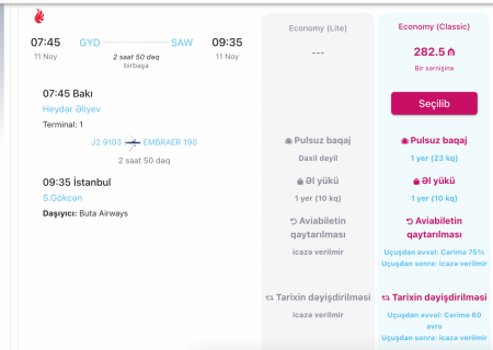 Amma AZAL-ın saytında satılan Buta Airways aviabiletinə (birinci xətt) artıq 23 kq baqajın daşınması daxildir, həmçinin onu cərimə ilə dəyişdirib qaytarmağa imkan verir (bu, Buta Super tarifidir) və demək olar ki,100 manat ucuzdur.