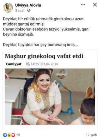 BakuNews.az Tribunainfo.az-a istinadla xəbər verir ki, jurnalist iddia edib ki, ginekoloqun ölümünə səbəb şou yazarı, məşhur jurnalist Türkan Məmmədli və onun dünən intihar edən həyat yoldaşı olub.