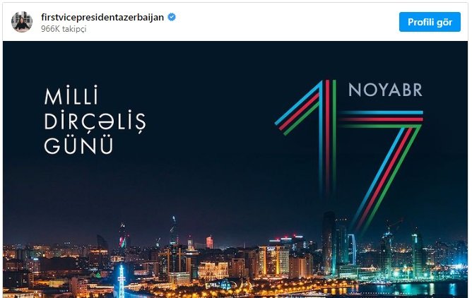 Azərbaycan Respublikasının Birinci vitse-prezidenti Mehriban Əliyeva 17 Noyabr - Milli Dirçəliş Günü ilə bağlı paylaşım edib. BakuNews.az paylaşımı təqdim edir: