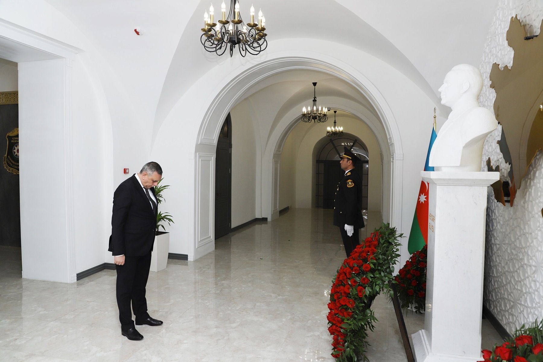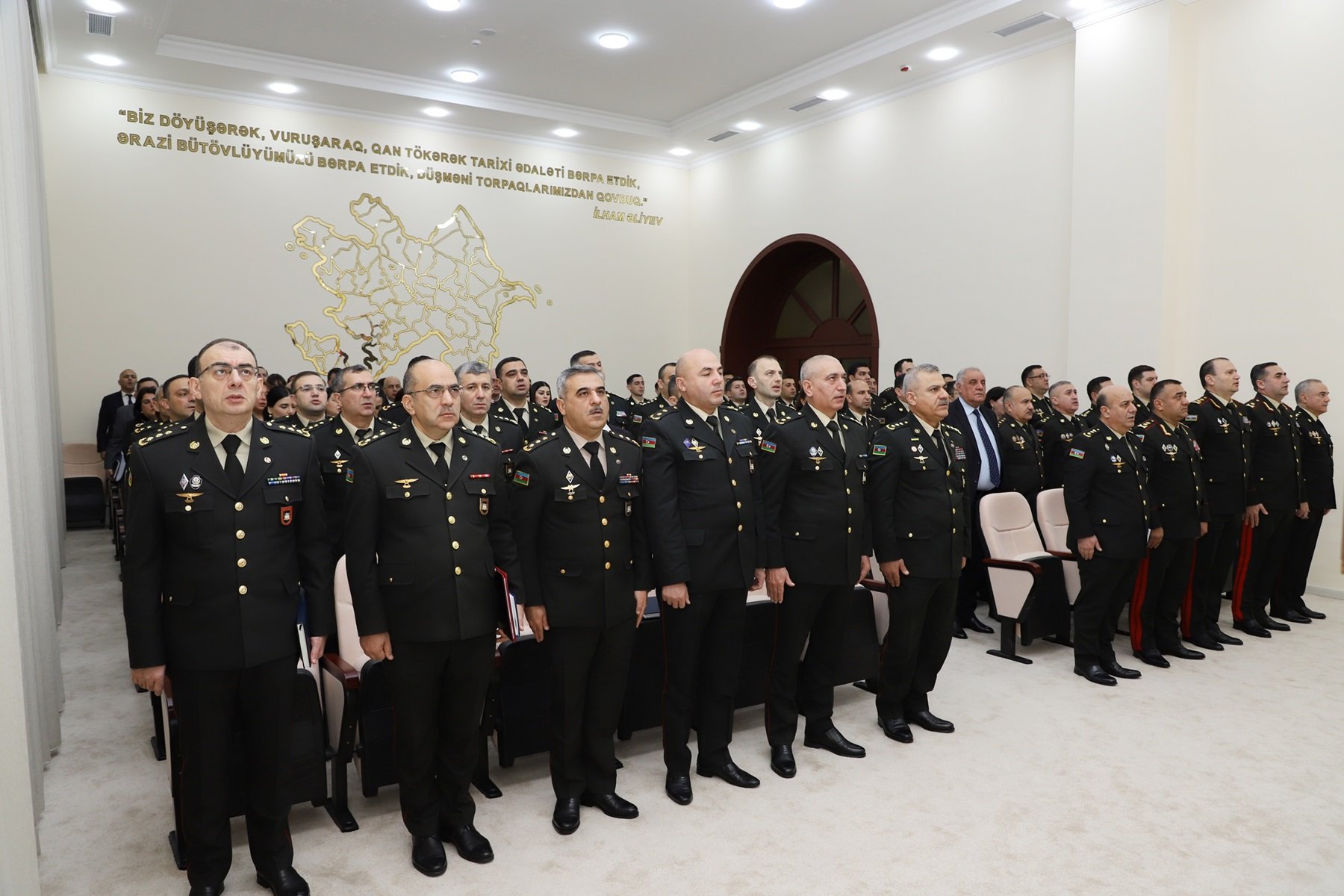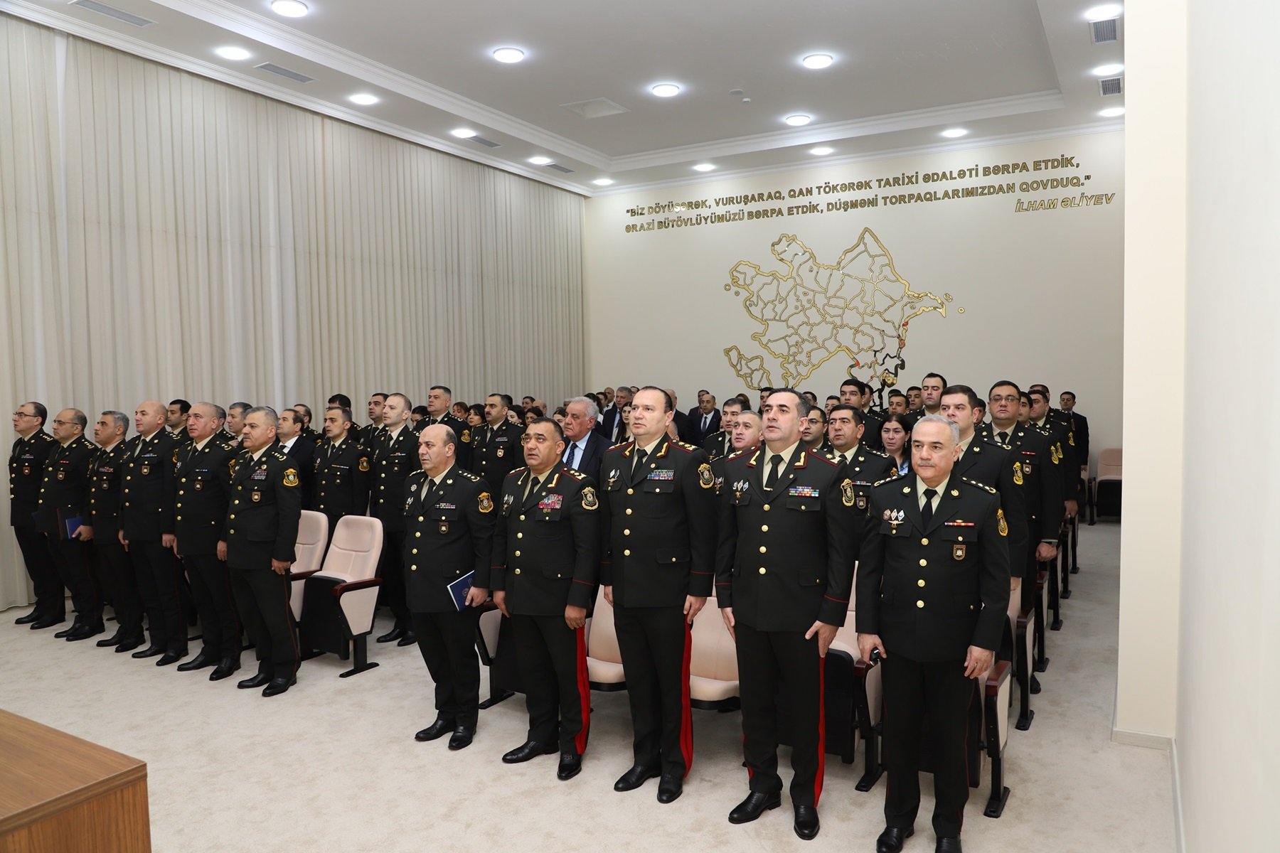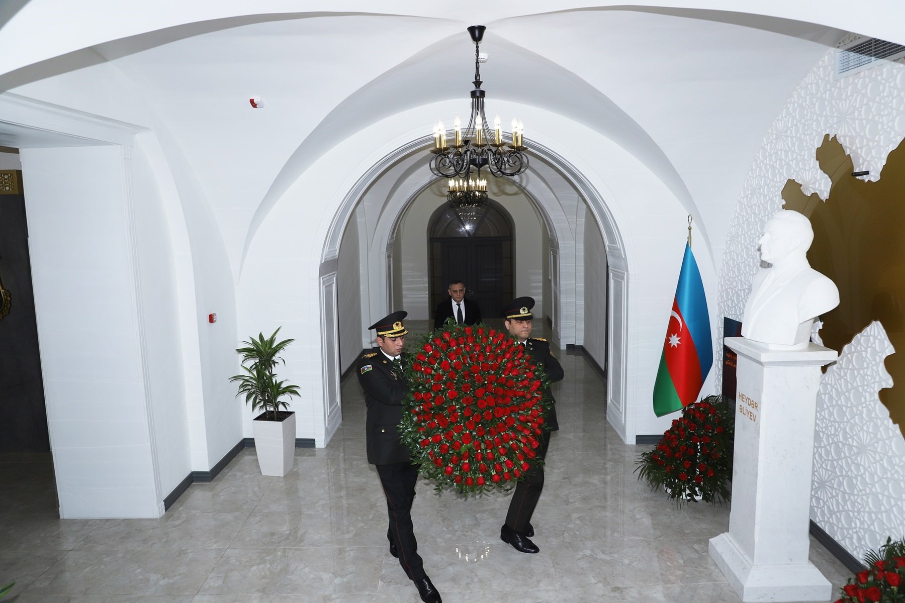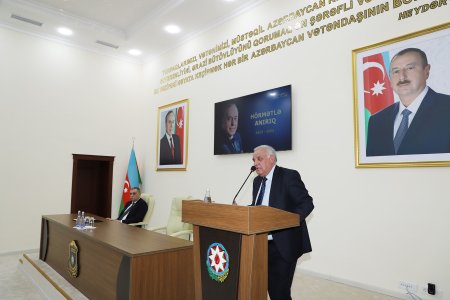 Mərasimdə çıxış edən Azərbaycan Milli Elmlər Akademiyasının Bakıxanov adına Tarix İnstitutunun Əliyevşünaslıq şöbəsinin müdiri, tarix elmləri doktoru Ədalət Qasımov Azərbaycan xalqının Ümummilli Lideri, görkəmli siyasi xadim Heydər Əliyevin çoxəsrlik dövlətçilik tariximizdə misilsiz xidmətlərə imza atdığını bildirib. Bütün fəaliyyətini Azərbaycana həsr etmiş Ulu Öndərin ötən əsrin sonlarında xalqın tələbi ilə siyasi hakimiyyətə qayıdışından sonra beynəlxalq normalara əsaslanan demokratik, hüquqi dövlət quruculuğu prosesini uğurla həyata keçirməklə yanaşı ölkəmizin gələcək inkişaf strategiyasını da müəyyənləşdirdiyini qeyd edib. Cəmiyyəti respublikamızın müstəqilliyi və ərazi bütövlüyünün bərpası uğrunda birləşdirməyə nail olan Ümummilli Liderin hərbi sahəyə önəm verdiyini, müasir ordu quruculuğu prosesinin əsasını qoyduğunu diqqətə çatdırıb.