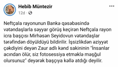 O, bunları qeyd edib: "Neftçala rayonunun Bankə qəsəbəsində vətəndaşlarla səyyar görüş keçirən Neftçala rayon icra başçısı Mirhəsən Seyidovun vətəndaşlar tərəfindən döyüldüyü bildirilir. İşsizlikdən əziyyət çəkdiyini deyən Zaur adlı kənd sakininin "İnsanlar acından ölür, siz fotosessiya etməklə məşğul olursunuz" deyərək başçıya kəllə atdığı deyilir".