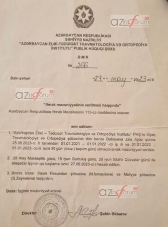 Azinforum.az olaraq, səslənən ittihamlarla bağlı Elmi-Tədqiqat Travmatologiya və Ortopediya İnstitutunun direktoru Şahin Əkbərovla əlaqə saxladıq. O, saytımıza açıqlamasında bildirdi ki, bacılarıla bağlı görülən tədbirin əsaslı səbəbi olub: “Onların dolabında lazımsız tibbi ləvazimatlar aşkarlanıb. Həmin dəriman və ləvazimatlar orada saxlana bilməzdi. Bütün bu hallar şöbənin müdiri və digər əməkdaşların iştirakı ilə sənədləşdirilib. Onlarla hətta humanizm çərçivəsində davranılaraq, eyni əmək haqqı ilə başqa şöbəyə işə keçiriliblər. Gedib hər yerə şikayət edirlər. Hamısına da cavablar vermişik. Biz heç bir qanunsuzluq etməmişik”.