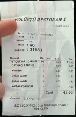 "Deməli, bu Astara yolunda "Yolüstü" restoranında dedik bir tikə yemək yeyək. Yeməkləri soruşduq (iş yerlərində olduğu kimi) qiymətləri normal dedilər..."