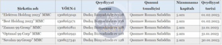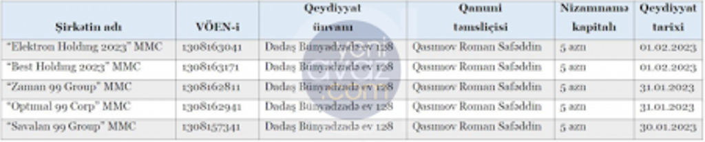 Tenderdə qalib olan şirkətlə bağlı diqqət çəkən başqa bir məqam odur ki, “Best Holding 2023” MMC-nin qeydiyyatda olduğu ünvanda eyni tarixlərdə, eyni nizamnamə kapitalı ilə eyni şəxsin qanuni təmsilçi olduğu və bənzər adları olan daha 4 şirkət qeydiyyata alınıb: