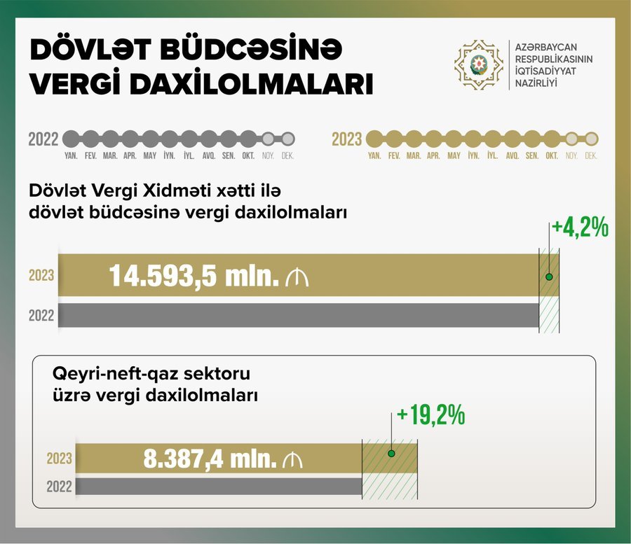 “2023-cü ilin yanvar-oktyabr aylarında Dövlət Vergi Xidmətinin xətti ilə dövlət büdcəsinə vergi daxilolmalarının həcmi 2022-ci ilin eyni dövrü ilə müqayisədə 4,2% artaraq 14 milyard 593,5 milyon manat olub”.