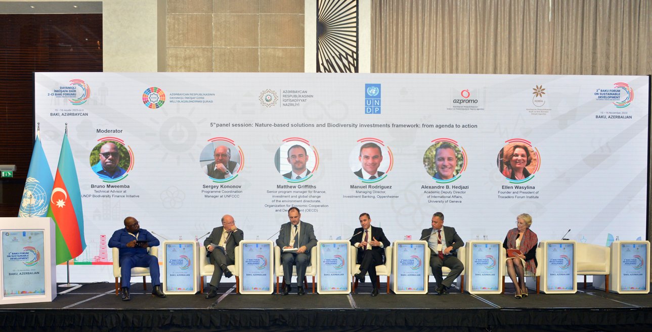 Forum çərçivəsində “Biomüxtəliflik investisiyaları çərçivəsi: gündəlikdən fəaliyyətə” mövzusunda sessiyada biomüxtəlifliyə sərmayə qoyuluşu, təbiətə əsaslanan həllər, dünyada bu sahədə mövcud təcrübələr barədə məlumat verilib, təbii yaşayış mühitlərinin qorunması və bərpası üçün davamlı maliyyə ayrılmasının, eləcə də davamlı təcrübələrin təşviqinin önəmi qeyd olunub. “İnvestorlar üçün interaktiv sessiyalar: Azərbaycan Respublikasında investisiya imkanları” mövzusunda sessiyada isə ölkəmizdə xarici investisiyaların cəlbi istiqamətində həyata keçirilən tədbirlər, sərmayədarlar üçün yaradılmış əlverişli investisiya mühiti barədə məlumat verilib.