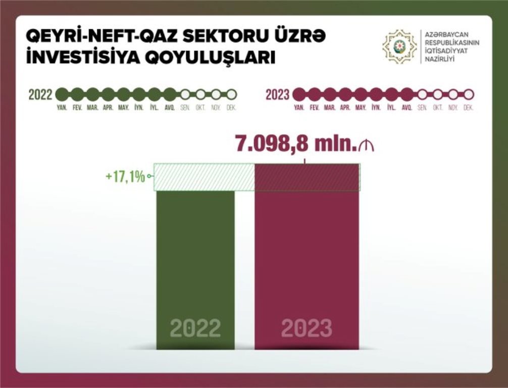 İqtisadi artıma təsir edən mühüm amillərdən olan qeyri-neft-qaz sektoru üzrə investisiya qoyuluşları Azərbaycanda 2023-cü ilin yanvar-avqust aylarında ötən ilin müvafiq dövrünə nisbətən 17,1% artıb.