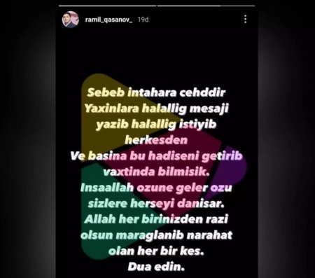 “Maraqlanan hər kəsə təşəkkürlər, inşallah, Ramil özünə gələcək. Səbəb intihara cəhddir. Yaxınlarına yazıb, hər kəsdən halallıq istəyib. Daha sonra başına bu hadisəni gətirib, biz də vaxtında bilmişik. İnşallah, özünə gələr, sizə hər şeyi danışar. Dua edin”.