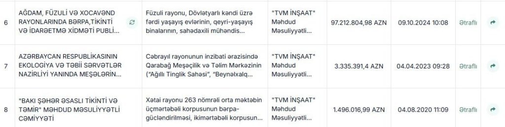 Qeyd edək ki, adıçəkilən şirkətlə Ağdam, Füzuli, Xocavənd Rayonlarında Bərpas, Tikinti və İdarəetmə Xidməti Publik Hüquqi Şəxs arasında 8 oktyabr 2024-cü ilin yanvarında Ağdam rayonunun Xıdırlı kənd yaşayış məntəqəsində 2, 3, 4, 5 otaqlı fərdi yaşayış evlərinin tikintisi işlərinin satın alınması prosesi həyata keçirilib. Həmin razılaşmaya əsasən Publiki Hüquqi şəxs “TVM İnşaat” MMC-yə 135 milyon 920 min 148 manat ödəyib.